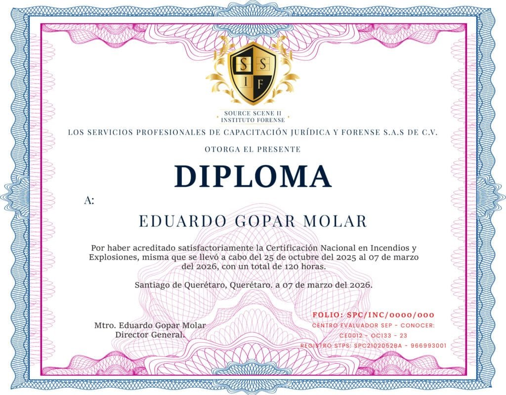 Diploma de terminación de la Certificación Nacional en Incendios y Explosiones.