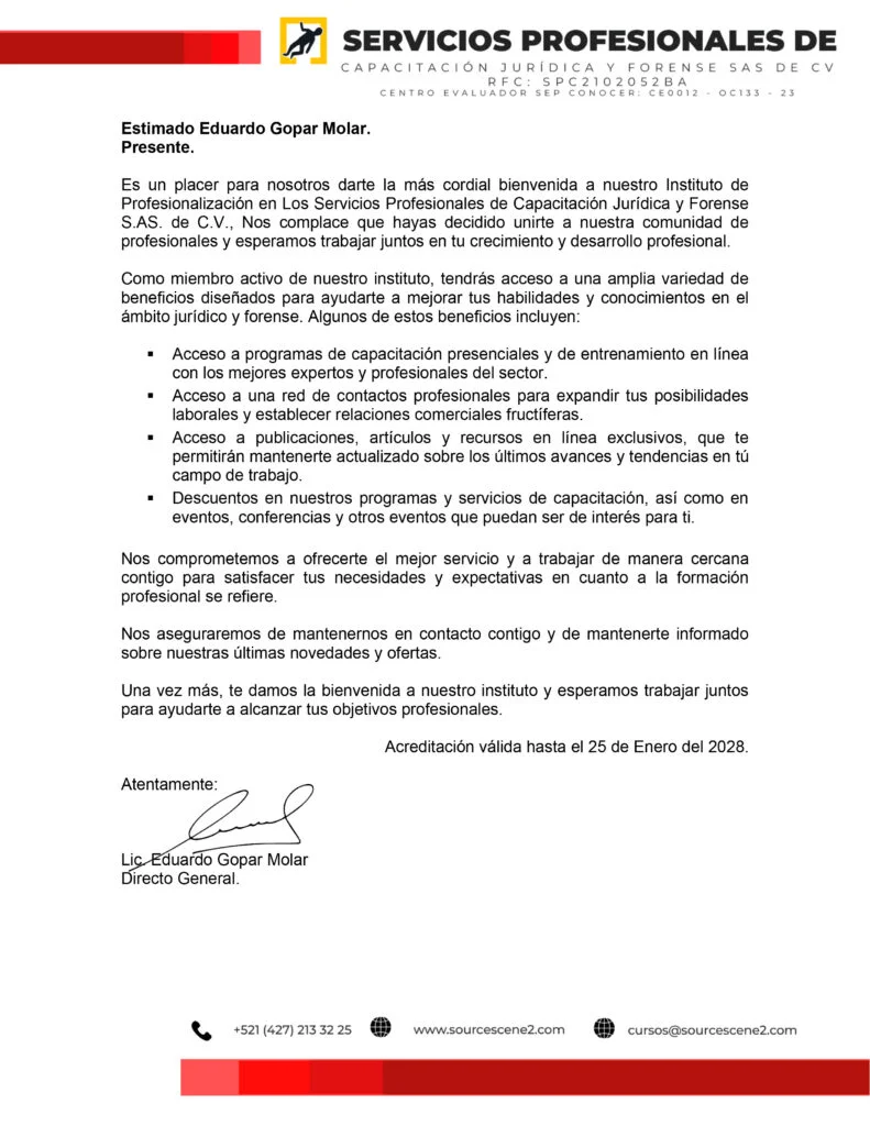 Carta que lo acredita como miembro de los Servicios Profesionales de Capacitación Jurídica y Forense SAS de CV, por una duración de 3 años.