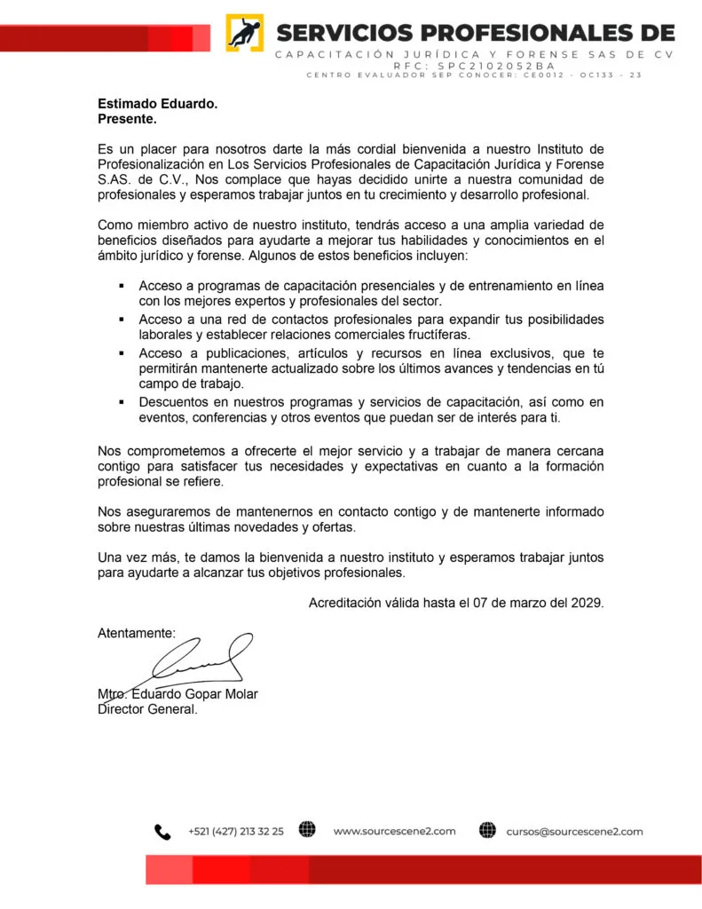 Carta que lo acredita como miembro de los Servicios Profesionales de Capacitación Jurídica y Forense SAS de CV, por una duración de 3 años.